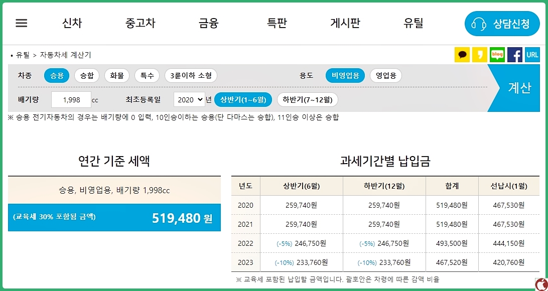 이런 자동차세도 유지비의 일부이기 때문인데요. 이런 자동차세 과세기준이 어떻게 되는지 알고 싶으셨던 분들은 여기에 나와 있는 내용을 봐주시면 좋고, 일일히 계산 할 필요 없이 바로 자동차세를 알려주는 자동차세 계산기도 이용해보실 수 있습니다. 이 사이트를 이용해서 편하게 계산해보시길 바랍니다.^^