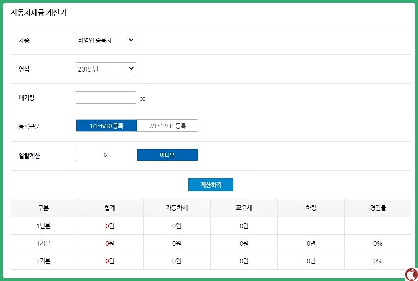 자동차세 계산기 페이지로 들어오면 차종, 용도, 배기량 등을 입력하도록 되어 있습니다.
